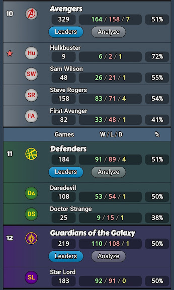 Hulkbuster 💪 he is the statistical best leader of the month with at least 10 games played. Who had that on their bingo card? Steve 1 is back as the most popular Avengers leader, Sam is untypically struggling a bit and First Avenger drags down the affiliation stats.