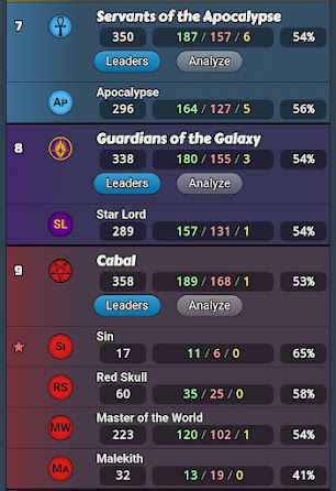 Red Skull is back with a vengeance? Apparently so but Master of the World is the defacto leader of Cabal nowadays and did very well too. Even Malekith gets to 50/50 here. Sin keeps a positive record which is most astonishing.